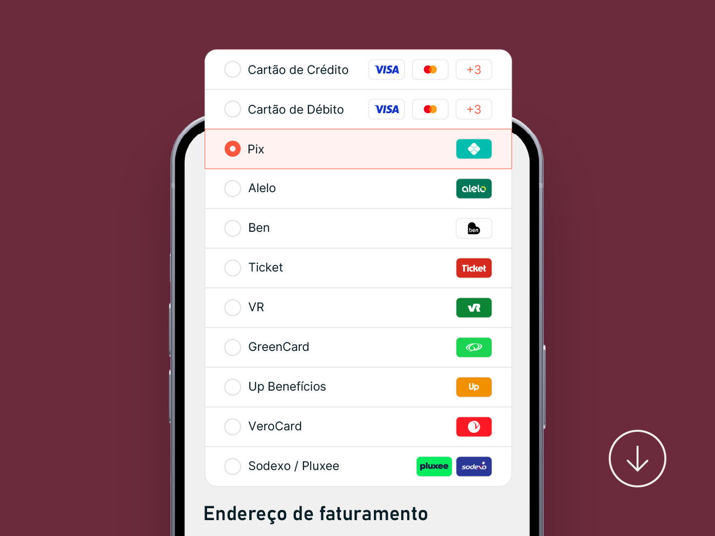 Cartão de crédito: Visa, Master, Amex, Elo, Diners, Aura, Cabal, JCB, Discover e Hipercard.